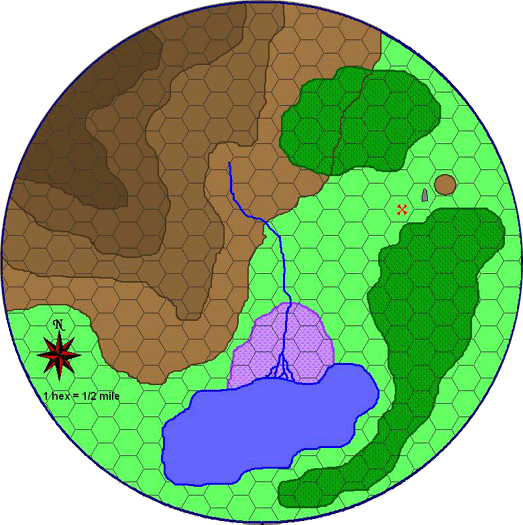 The PCs will come across the first pyrohydra, which will be basking in a shallow bog (purple shading) about 60 ft in diameter. The rest of the terrain is rocky land punctuated by large boulders (grey shapes, height roughly equal to diameter) but clear of undergrowth, except for a few patches of light undergrowth (green shading) and a few small trees. The red arrow indicates the upwind direction (i.e. the wind is blowing from west to east), which is the direction the killoren will attempt to use to sneak up towards the pyrohydra.