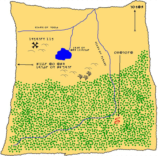 The two dead lizardfolk at the Shrine, as well as the first two forces sent in this scenario, have in their possession a map drawn on human skin that shows the location of both the Shrine and the outpost. Two versions of the map are presented here, the first untranslated, with the labels in their original Slith. The other is the same map with the Slith translated.