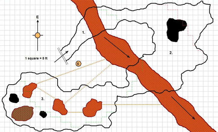 Creatures: An elder magma elemental and four of its minions hide in the lava flow, completely submerged (the elder paraelemental is crouched). The magma elementals have the ability to see through magma and lava as if it were clear water, and this allows them to use the spot as an ambush point against intruders.