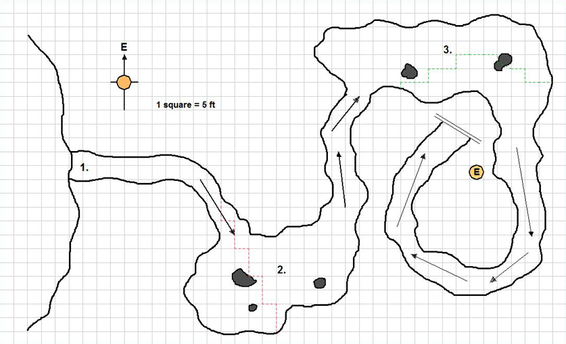 The circle marked with an "E" shows the location of a level 3 earth node, in lower level. The node is 50 ft below the level of the entrance.