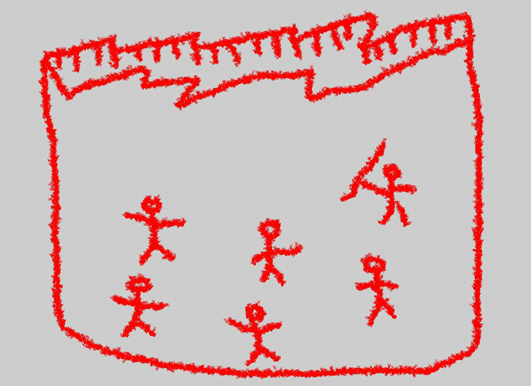 | The flickering shadows cast by oil lamps set into their cressets plays along paintings of dinosaurs, upright turtles in robes, and figures wielding a staff. Just inside the cave, on the floor, is a strange geometrical diagram carved into the stone. |