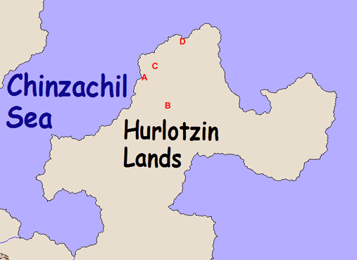 The PCs are free to get to the Hurlotzin Lands however they wish. Walking is possible, but it would be an amazingly lengthy journey, full of peril. This is not the ideal means of arriving simply because such a long journey through such hostile lands should involve much adventure, lest the DM not fully represent to the PCs just how wild and dangerous most of Sazhansiir is. However, a DM accurately running such a trek would find it consumes many gaming sessions and likely gives the PCs enough XP that they grow too powerful for this scenario! In such a case, the DM can adjust the encounters presented in this scenario to challenge such a group of PCs accordingly.