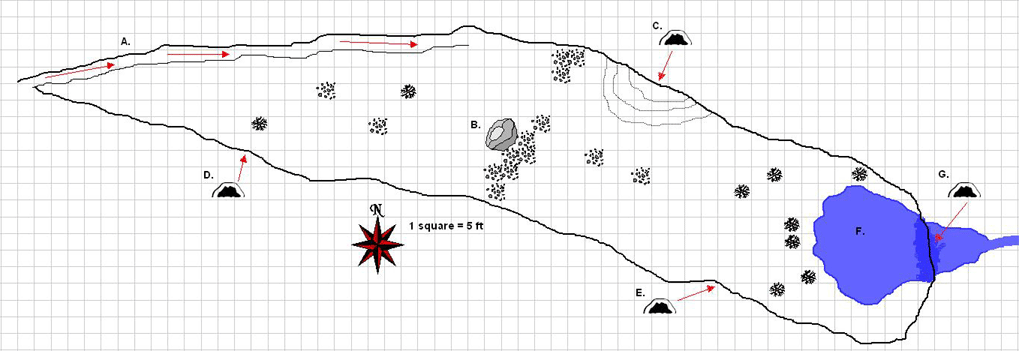 One possible avenue of attack unique to the topography of the Cleft is that the PCs might choose to simply stand at the rim of the Cleft and rain spells and missile attacks on anything that moves at the Cleft bottom. This is not a bad tactic, especially against the initial undead guardians of the place. And the worshippers might initially emerge from their caves to try to battle such attackers, but given their lack of powerful ranged attacks, it is more likely that the worshippers will eventually fall back into their caves, realizing that they are in no particular hurry and the defensive terrain of the caves favours them in such circumstances, especially since most of the inhabited cave complexes are linked to one another. Furthermore, returning hunting parties can harrass the PCs from behind and try to make their way into the caves to reinforce them.