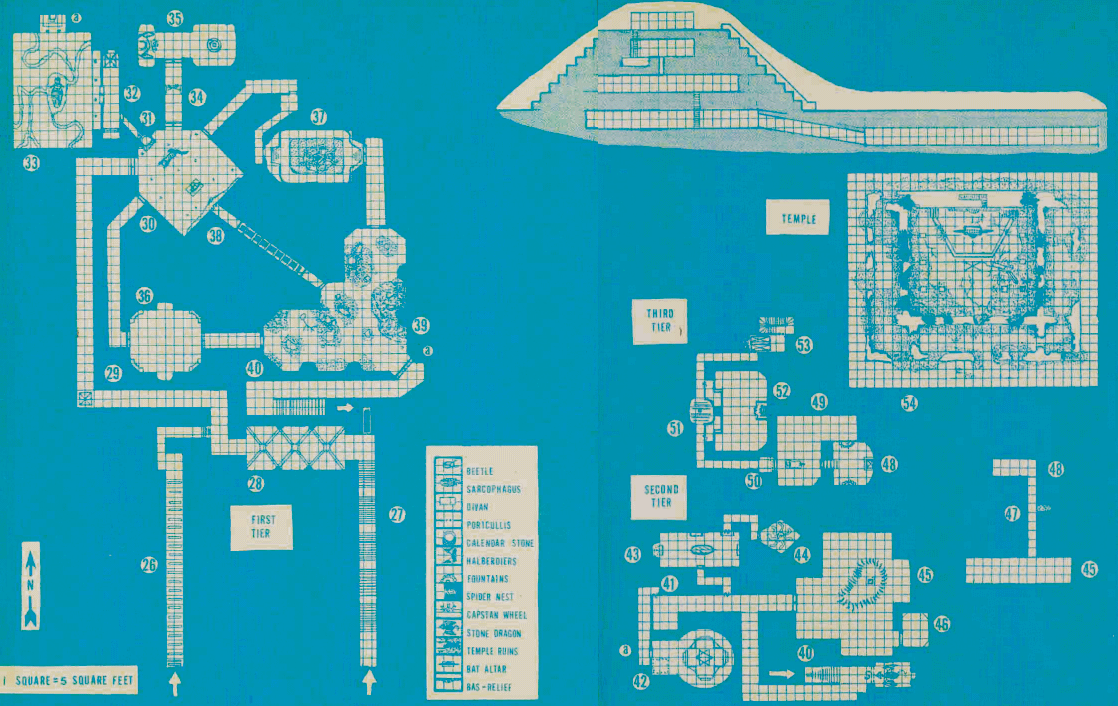 Treasure: The "treasures" of this room are only worth a couple of silver apiece. If all 800 pieces of junk jewelry are taken the total value is 800 gp and the weight will be 10 lbs. The actual treasure is concealed in the bottom of the two wicker basket urns, beneath the stones. These are two crushed silver masks, each worth 25 gp, a gold serpent bracelet worth 42 gp, a broken marble statue of a monkey, 56 gp, and 3 silver hairpins set with jade worth 20 gp each.