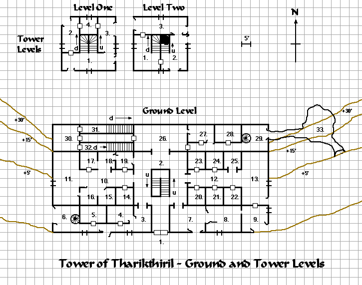 This scenario can take place after the scenario entitled "A Taste of Honey", or it can stand on its own. During "A Taste of Honey", the party will have heard of rumours of the tower from Adazil, the dwarven merchant who hired them to gather giant bee honey. In fact, if they chose the westernmost route to the bee hive, they may have run afoul of Tharikthiril's groundlings and even been lured into the tower at some point.