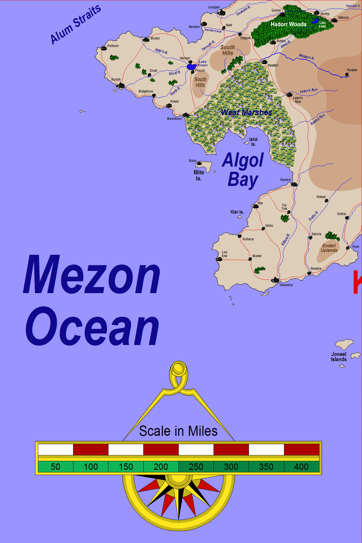 The Duchy of Wardria stretches from the border of Algol in the north to about halfway to Iltar and Far Trek. A mostly wild area of rolling hills and small bits of woodlands, the only community of any size is Wardria, which boasts of a population of about 4,000. At least 400 of the population are halflings. The town itself is walled by stone and surrounded by a dry moat, owing to its proximity to the West Marshes and the foothills of the Mountains of Onlor.