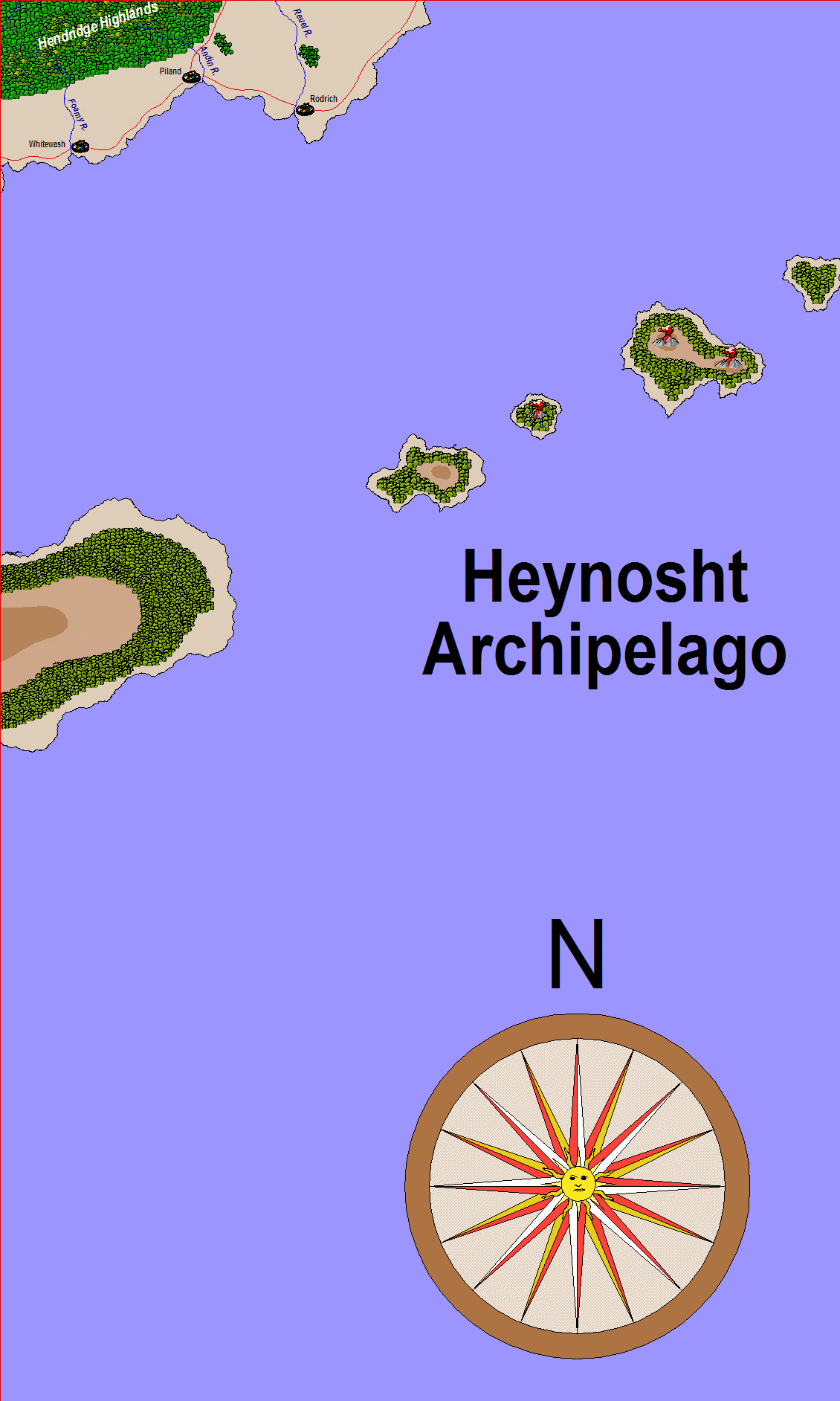 But Onlora was not powerless, and fearing for her children (the halflings) she gathered up her carefully hoarded power and ripped from Jerranq that section of the mainland in which her children dwelt. Urgently forming an alliance with the Mother of Earth (Dhalis) and the Father of the Seas (Hotor), she moved this chunk of mainland south and west, and so the Isle of Onlor found its current position. The pieces of land that broke off during this movement fell into the sea, and where the sea was shallow enough or where the chunks were tall enough, islands were formed...and thus was the Heynosht Archipelago born.