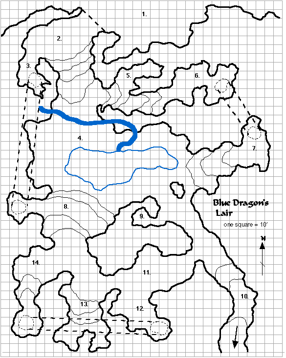 The dragons also have a few dirty tricks with regard to the pool in area 4. A favoured tactic is to wait at the entrance to area 7 and listen for sounds of someone crossing the stream into area 4. While someone is crossing, the dragon breathes his breath into the water just at the point that it emerges out of the wall and into the lake. The lightning touches the water and erupts in a fireball-sized radius, extending 20' out towards the lake, and also extending some 80' back up the 5' wide stream! Anyone caught in the eastern 40' of the stream as it crosses the entry into area 4 will be hit by the jolt of dragon's breath . ostensibly without ever seeing the dragon that breathed it or knowing from whence it came!