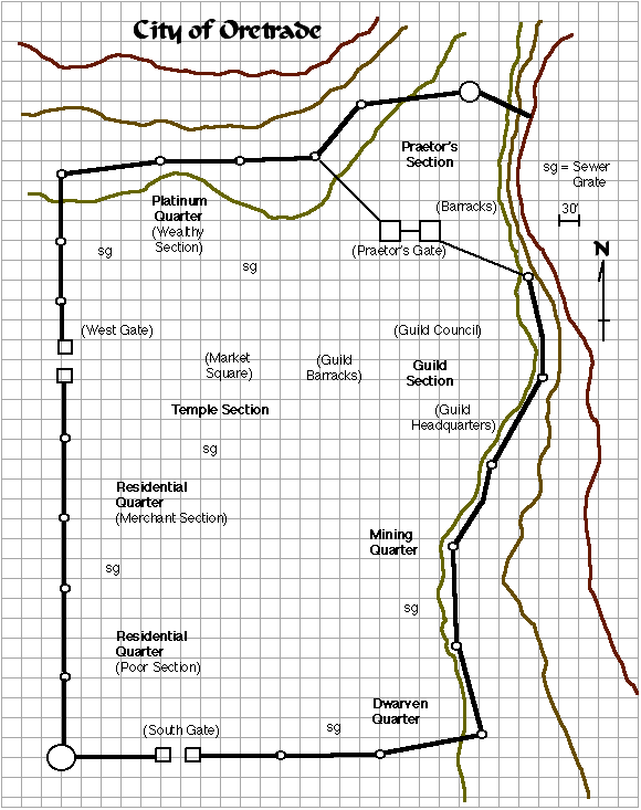 If the party is foolish enough to tell the Guild or anyone in Oretrade exactly what they seek (i.e. the lost treasure trove of the Mandarin) they will have made a very big mistake. Treasure fever will grip the city. The Guild will attempt to be the first to the treasure, with Chalance and his men heading into the sewer. They will be followed by the Praetor and his men, and very likely open conflict between the Guild and Praetor will develop. Needless to say the Praetor will win, after the Guild's calls to the populace to rise up go largely unheeded. The Praetor will then post guards at all sewer entrances and send word to the Consul asking for more troops and treasure hunters to open the trove.